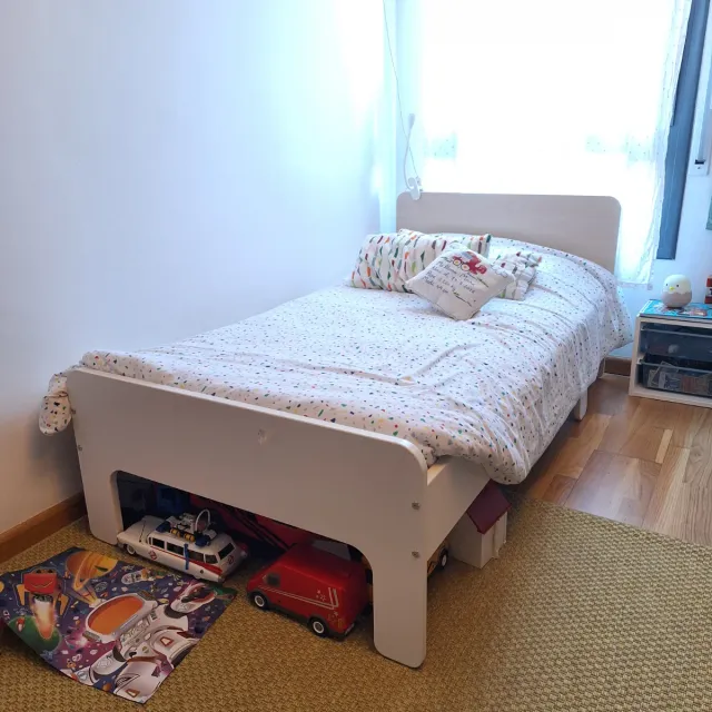 Detalles del productoCama infantil extensible de madera en color blanco y el cabezal en color roble.