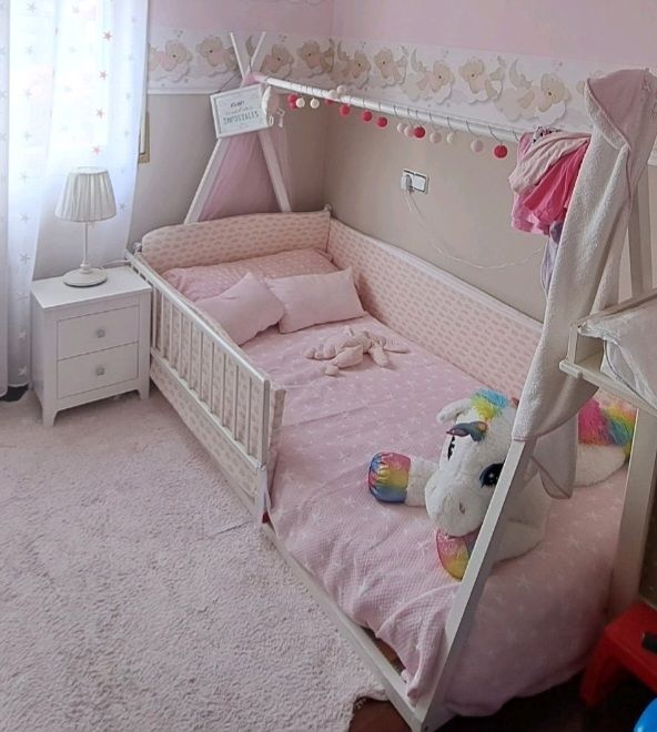 Detalles del productoCama tipi Montessori infantil de madera blanca, con estructura de tipi. Estructura de madera blanca. No está incluida textil ni la barrera . Estructura de largo 190x 100 cm