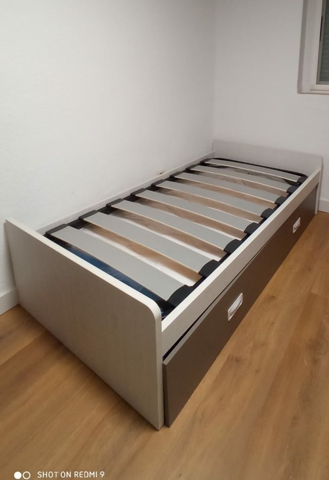 Detalles del productoConjunto de cama nido de 90*1'90. Dos somieres . Nuevo a estrenar por traslado.Posibilidad de colchón viscoelástico a estrenar . Precio de mercado 580, se vende a 350€. Medidas del producto