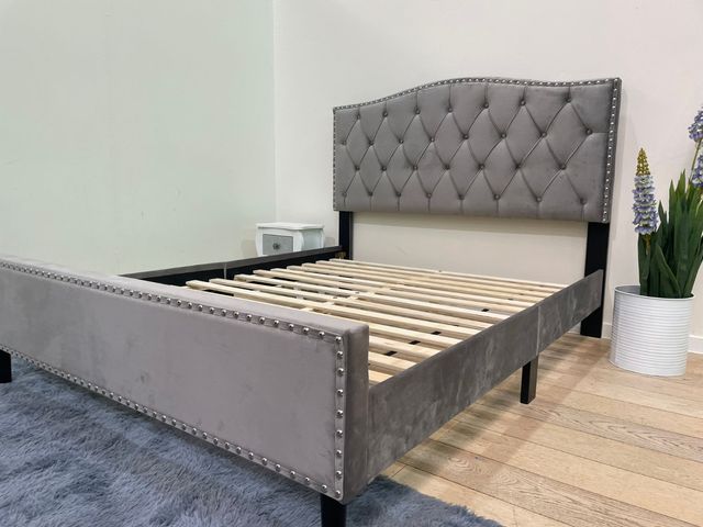 Cama tapizada en terciopelo GRIS y azul – NUEVA