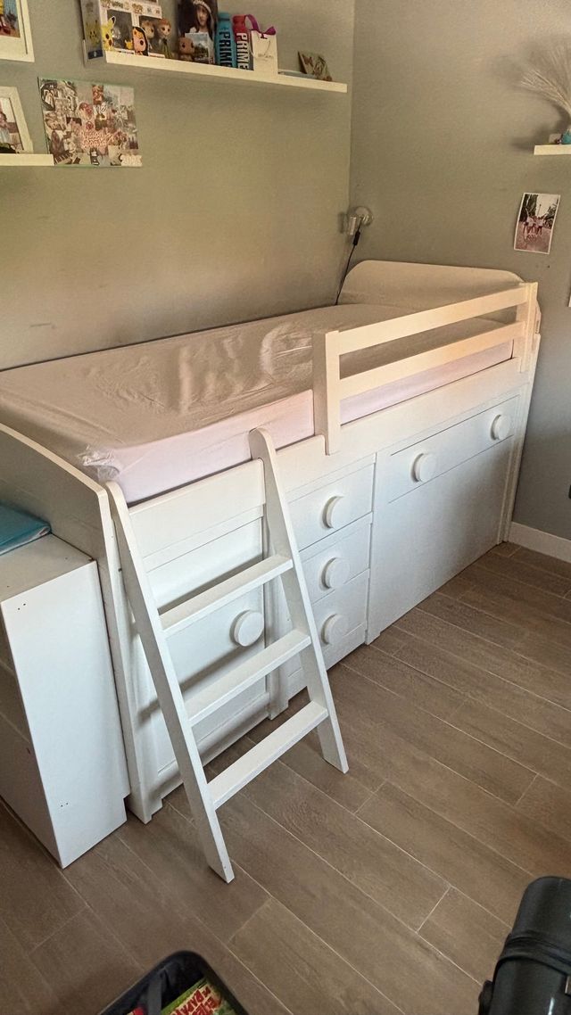 - Incluye estructura de cama, somier, barandilla, escalera y cabecero.
