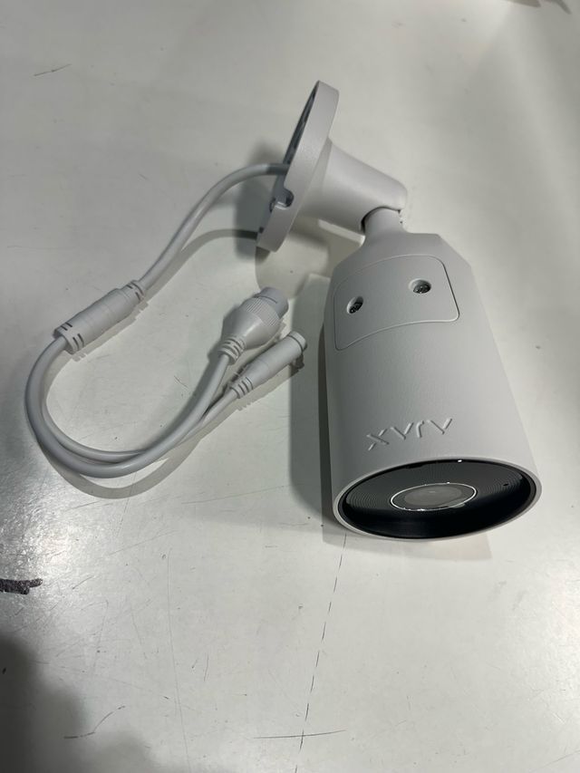 Cámara de seguridad tipo bullet con resolución de 5MP y lente de 4mm. - Diseño elegante en color blanco. - Conexiones para alimentación y datos.