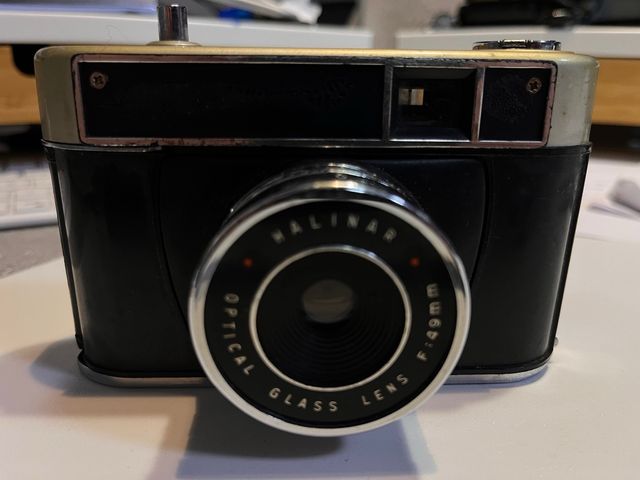 Cámara fotográfica antigua con lente Malinar. - Lente: Malinar Optical Glass Lens F:49mm. - Diseño clásico en color negro y plateado.