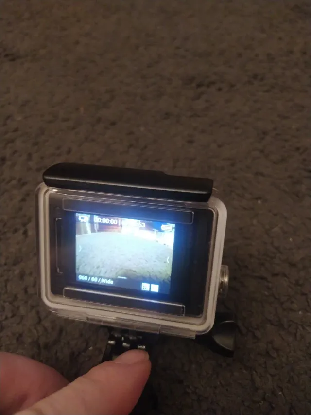 Cámara de acción GoPro en su carcasa protectora. - Pantalla LCD integrada. - Lente gran angular.