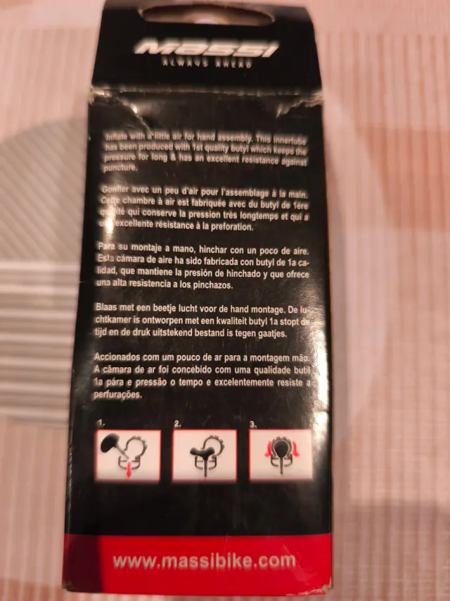 Detalles del productoCámara de aire para bicicleta de la marca Massi, fabricada con butilo de alta calidad.