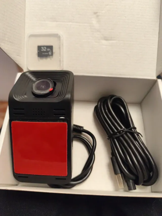 Cámara para coche con todo lo necesario para su instalación y uso. - Incluye tarjeta de memoria de 32GB. - Cable de conexión. - Soporte adhesivo.