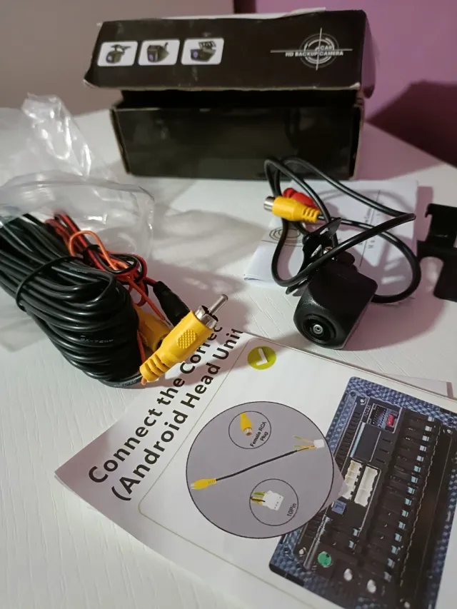Cámara de visión trasera HD para sistemas Android. - Conexión RCA. - Incluye cables de conexión.
