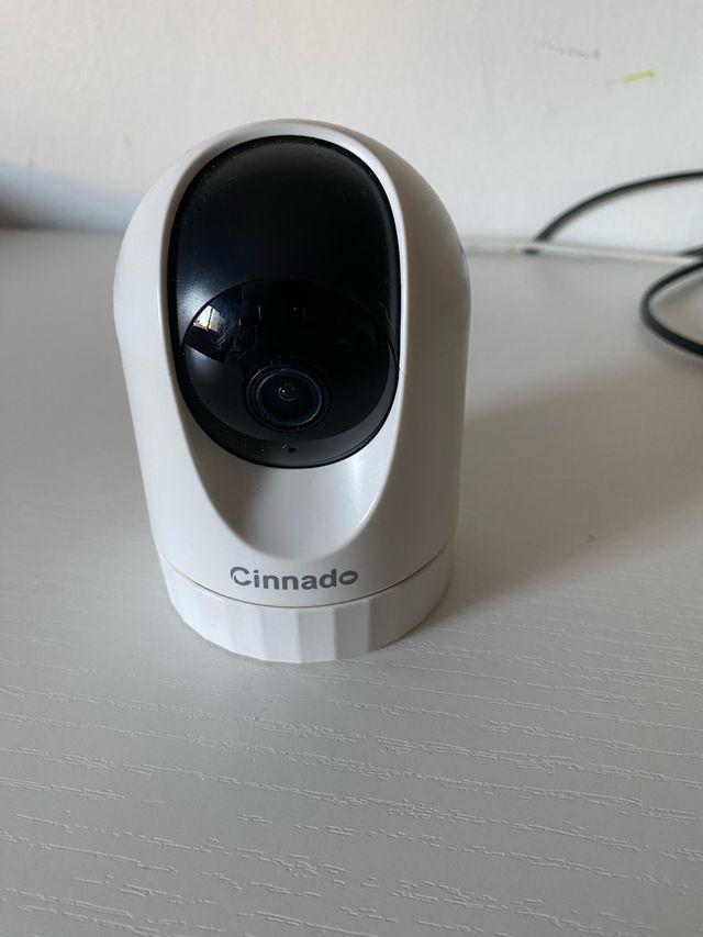 Cámara de vigilancia de la marca Cinnado. Diseño moderno y compacto. - Color blanco. - Lente negra. - Base con el nombre de la marca.