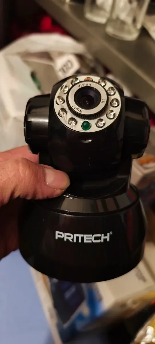 Cámara de vigilancia con diseño moderno y compacto.no se cómo. Funciona. - Color negro brillante. - Base giratoria. - Lente con visión nocturna IR.