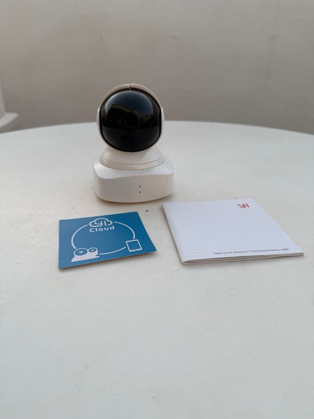 Cámara de vigilancia Yi con diseño moderno y compacto. - Cámara de vigilancia. - Incluye manual de Thank you for choosing Yi-Cloud Camera 1080p. - No funciona