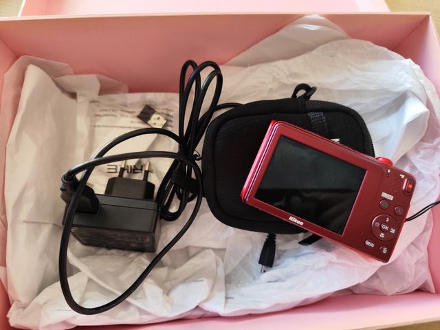 Cámara digital compacta Nikon en color rojo. - Incluye cargador y funda protectora.