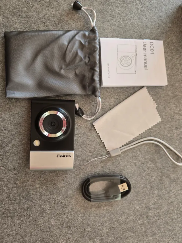 Cámara digital compacta en color negro y plateado, en su caja. Nuevo. - Incluye funda protectora. - Incluye paño de limpieza. - Incluye cable de carga USB.