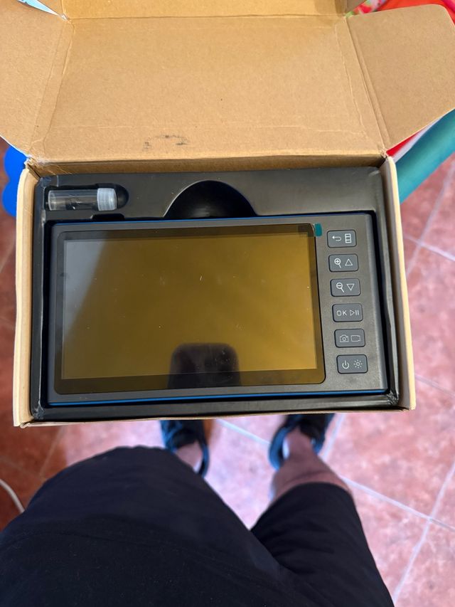 Cámara digital con pantalla táctil y botones de control. - Pantalla de 7 pulgadas. - Botones de navegación y encendido.