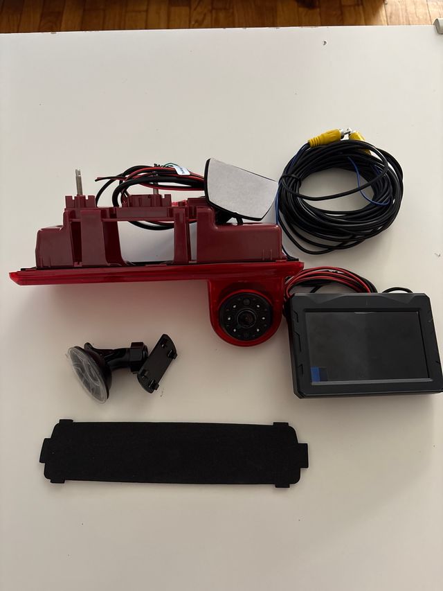 Kit de cámara trasera para coche con visión nocturna. - Incluye pantalla. - Cableado de conexión. - Soporte con ventosa.