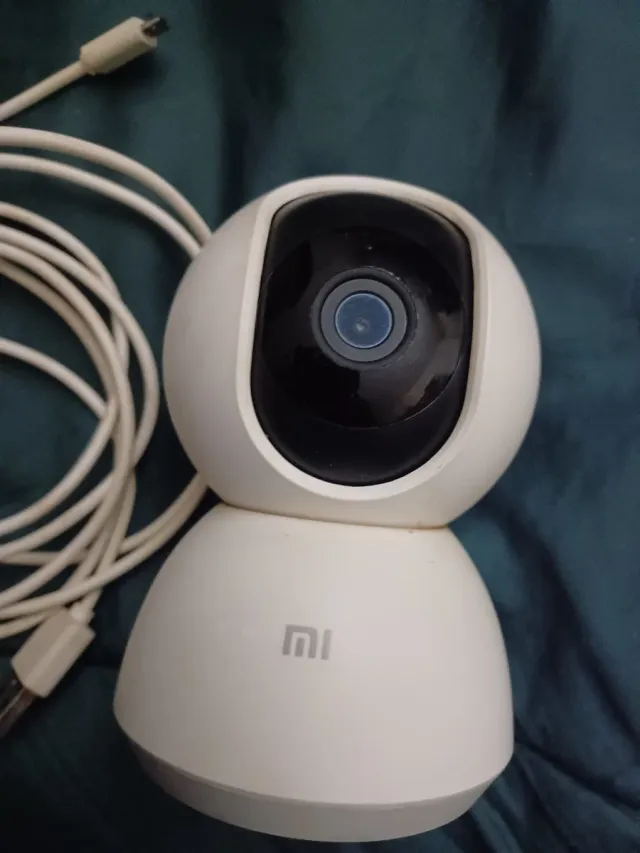 Cámara de videovigilancia con un diseño moderno y compacto. - Color blanco. - Base giratoria para ajustar el ángulo de visión. - Logo de la marca visible en la base.