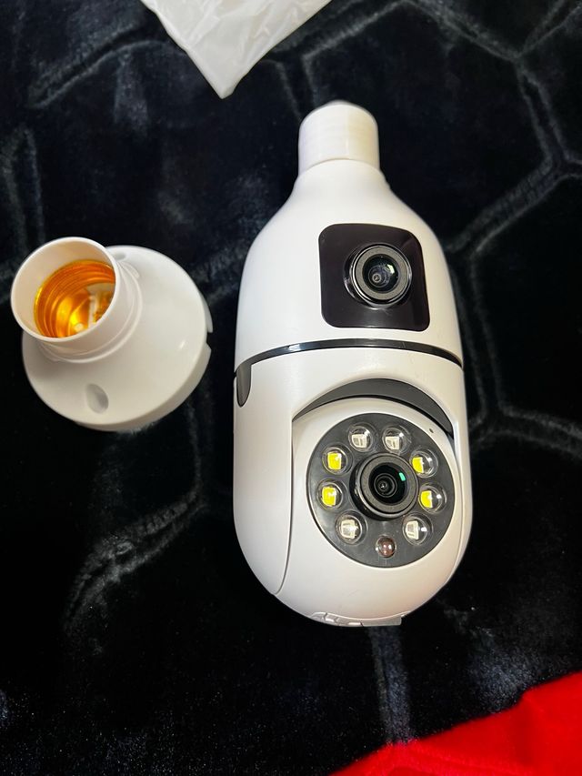 Cámara de seguridad con conexión WiFi. - Diseño moderno en color blanco. - Incluye soporte para bombilla. Incluye tarjeta micro sd de 128gb