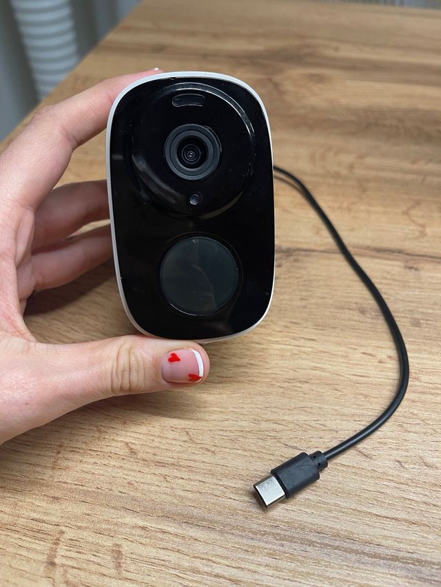 Detalles del productoCámara de seguridad blanca con conexión WiFi y batería recargable. Compatible con la app O-Kam Pro.
