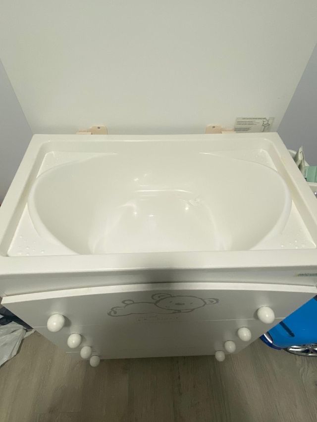 Está como nuevo, hecho de madera de calidad 🌲, muy resistente y bonito. Cómo se ve en la foto, tiene una bañera. Todo en uno!🤗