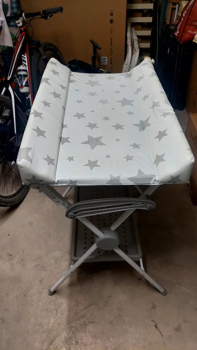 Detalles del productoCambiador de bañera con un divertido estampado de estrellas grises sobre fondo blanco. Es plegable y fácil de guardar. Tiene un pequeño desperfecto como se ve en la foto