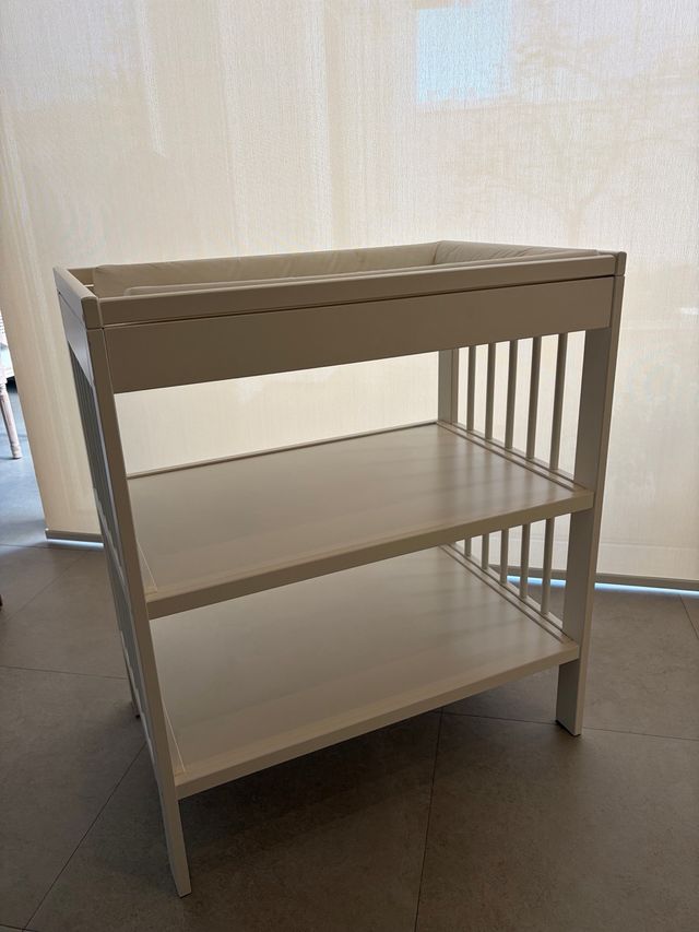 Detalles del productoCambiador de bebé de la marca Ikea en color blanco. Cuenta con una estructura de madera y tres estantes.