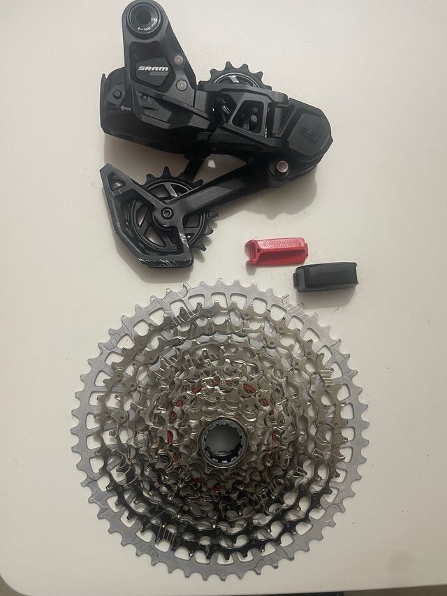 Detalles del productoConjunto de cambio SRAM AXS T-Type con batería y cassette.