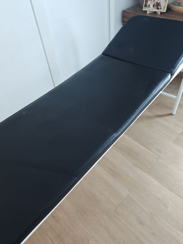 Cama de exploración clínica en buen estado. Ideal para consultas médicas o fisioterapia. - Estructura metálica. - Tapizado de vinilo negro.
