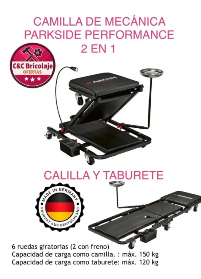 ✅Camilla de mecánica Parkside Performance 2 en 1, también funciona como taburete. Fabricada en Alemania.