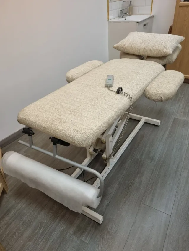 Detalles del productoCamilla eléctrica tapizada en tela natural de algodón y lino, con apoyabrazos extraibles y cabezal móvil. Amplia comodidad en prono y supino. Con extensión de longitud.