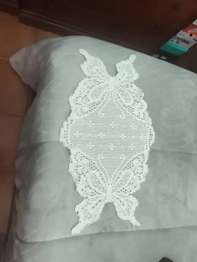 Precioso camino de mesa hecho a mano con crochet. - Diseño intrincado y delicado. - Color blanco. - Ideal para decorar cualquier superficie. Echo a mano 71cm por 41 cm