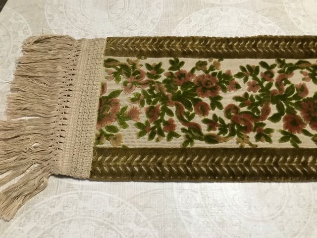Detalles del productoElegante camino de mesa con un diseño floral vintage, años 60. De terciopelo, con pasamanería. En perfecto estado. Medidas: 113 x 26 cm. Reverso forrado.