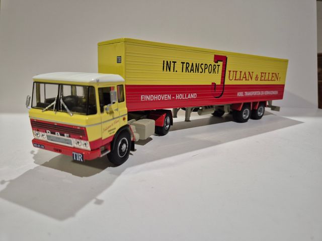 Detalles del productoRéplica a escala 1:43 del camión DAF 2600 con remolque de la empresa Julian & Ellen.