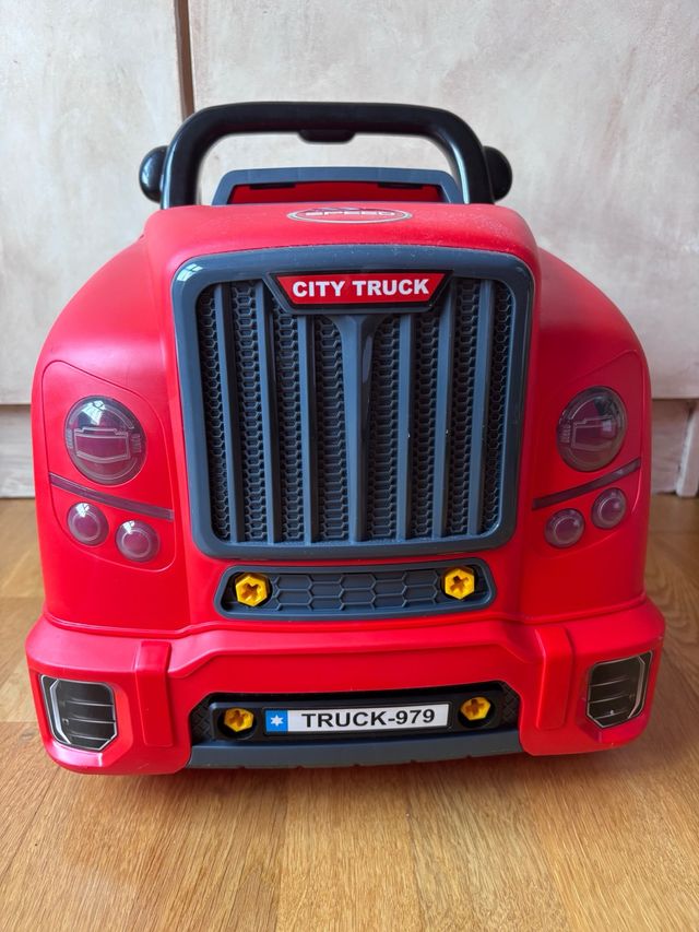 Camión de juguete de color rojo brillante, con detalles en gris y amarillo.