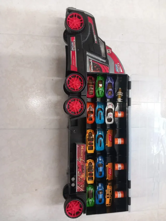 Detalles del productoCamión de juguete transportador de coches. Incluye varios coches pequeños.