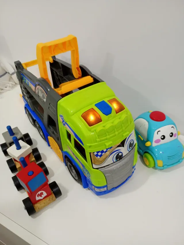 - Camión transportador de color verde y gris. El camión tiene luces y sonido .