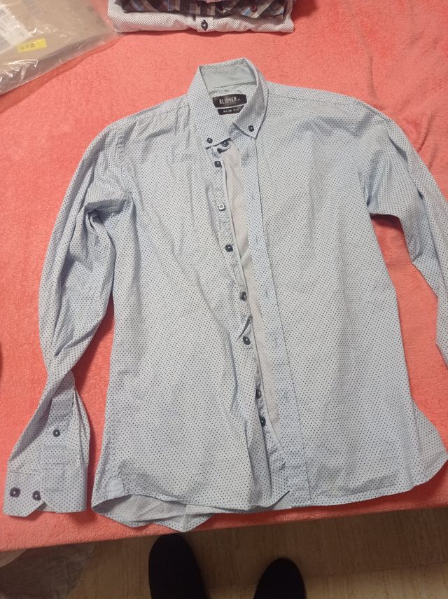 Camisa azul clarito de puntitos talla M con botones modernos cuadrados muy elegante. Como nueva