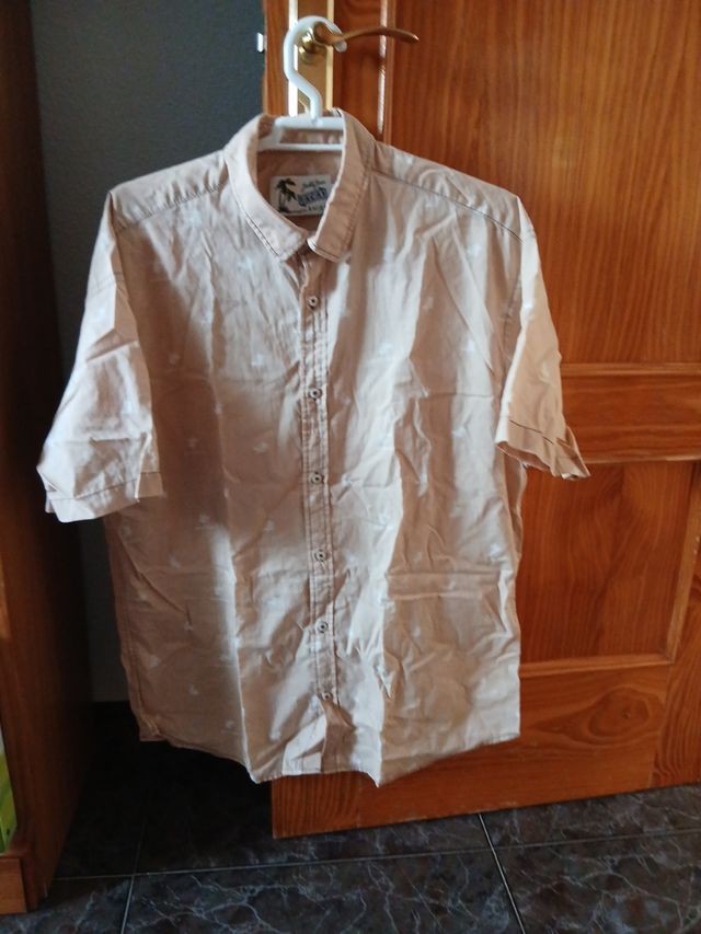 Camisa de manga corta para hombre de la marca Jack and Jones. Es de color beige y tiene un estampado de palmeras. Está en buen estado.