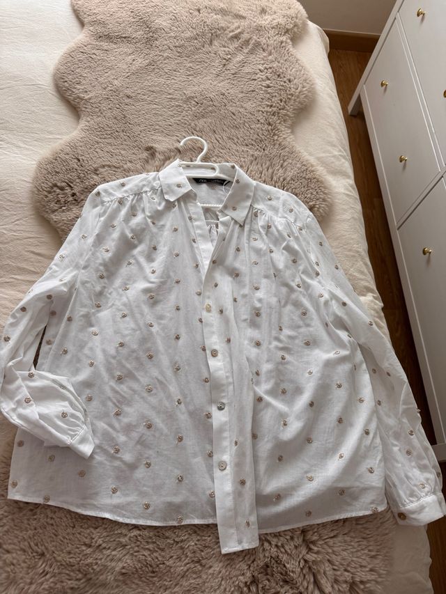 Camisa blanca con topos dorados