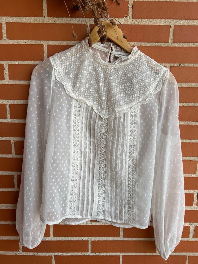 Blusa blanca blanca con detalles de encaje y puntilla.