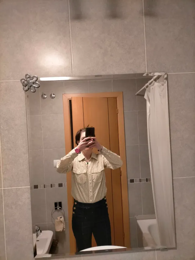 Camisa con dos bolsillos plastones en el pecho con solapas y botón. Tiene trabillas en los hombros cogido con botón. Tiene corte recto y abajo es recto. Estampado en amarillo y gris.