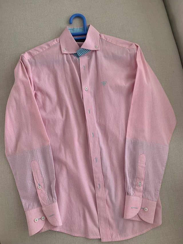 Camisa de manga larga con un diseño de rayas finas en tono rosa y blanco. Presenta un cuello con botones y detalles de cuadros en el interior.