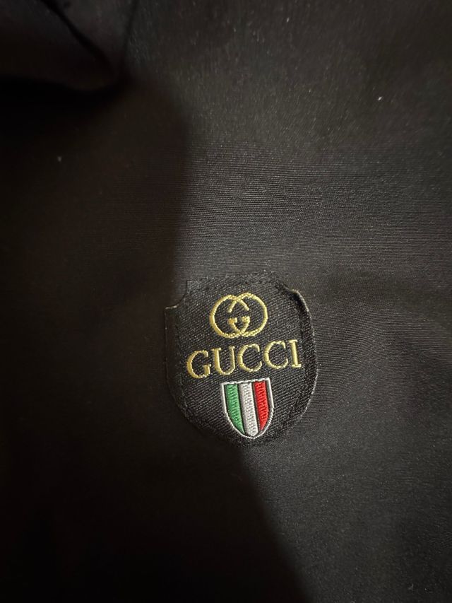Camisa de la marca GUCCI en color negro. Presenta un distintivo escudo bordado con el logo de la marca y las franjas tricolor.