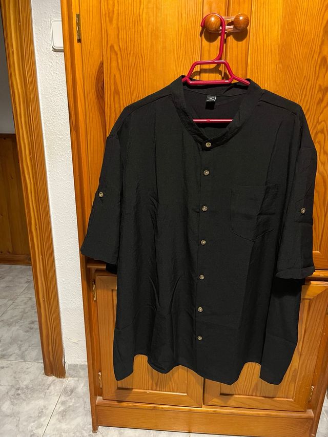 Camisa Negra Manga Corta Cuello Mao Caballero