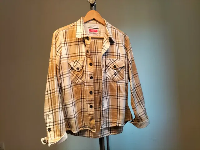 Camisa de paño con un diseño a cuadros en tonos beige y marrón.