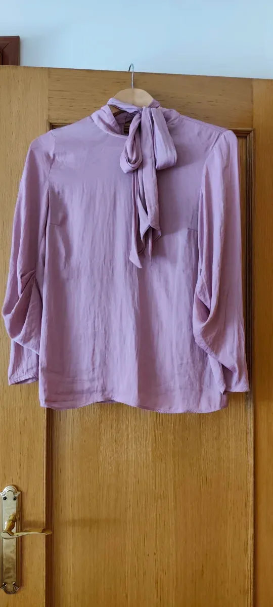 Camisa rosa tipo sateen con lazada