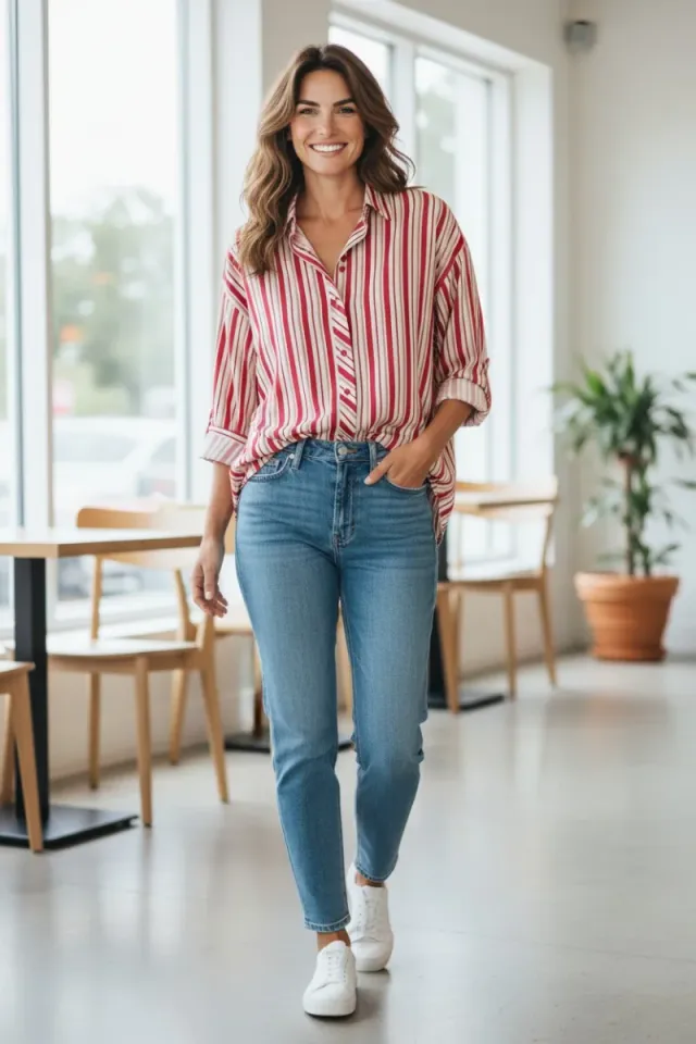 - Diseño de rayas rojas y blancas.
