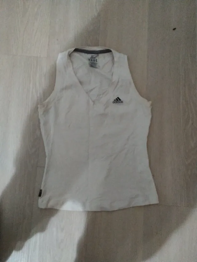 Camiseta deportiva Adidas de color blanco, ideal para entrenamientos. Talla S-M - Diseño sin mangas. - Cuello en V. - Logo de Adidas en el pecho.