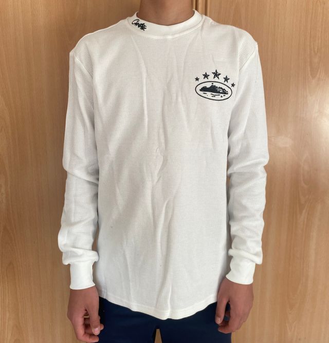 Camiseta de manga larga con un diseño gráfico en el pecho y texto en el cuello.