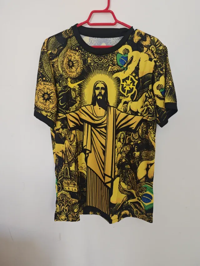 Detalles del productoCamiseta con un diseño vibrante y llamativo inspirado en Brasil y la figura de Jesús.