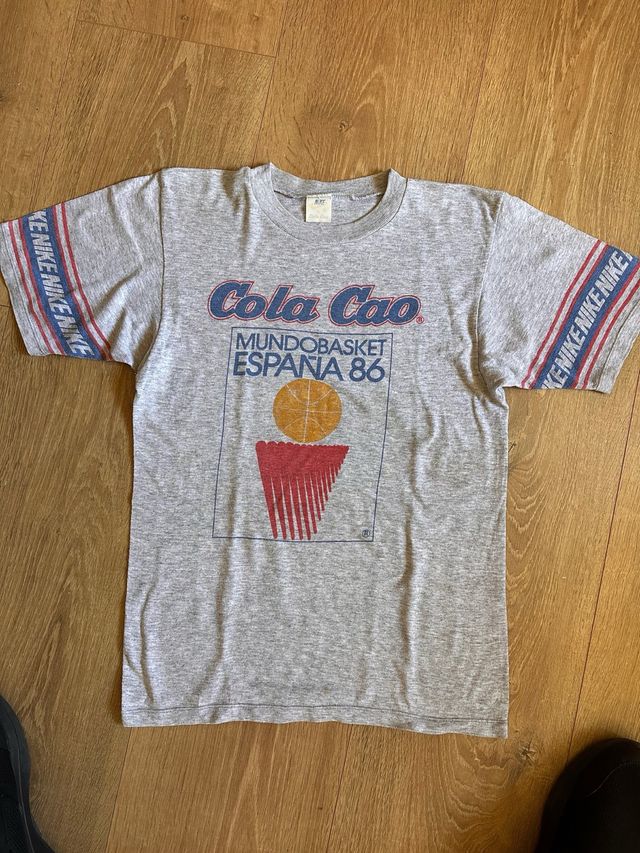 Detalles del productoCamiseta vintage de la marca Nike con diseño de Cola Cao y el Mundobasket España 86. la gota que se ve en la parte de atrás, es agua de la plancha, están perfectas, tengo dos. Talla M de niñ@