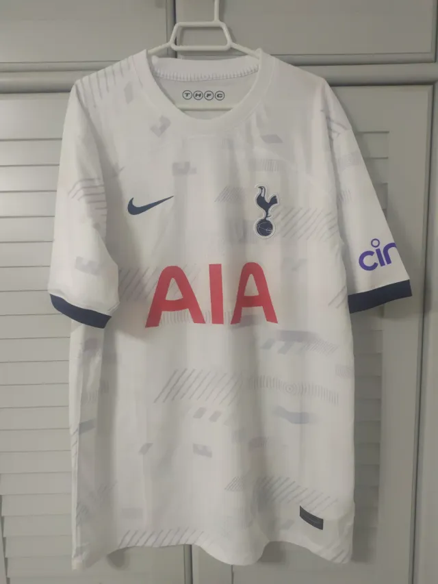 Camiseta de fútbol del Tottenham Hotspur, temporada 2023-2024. - Color blanco con detalles en azul marino. - Logo de Nike y escudo del club. - Patrocinador principal AIA.